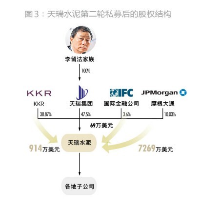 2008年,天瑞水泥繼續(xù)獲得第二輪合計8252萬美元私募股權(quán)融資,其中摩根大通投資7269萬美元獲得10.03%股權(quán),KKR繼續(xù)跟投914萬美元,國際金融公司跟投69萬美元(圖3)。