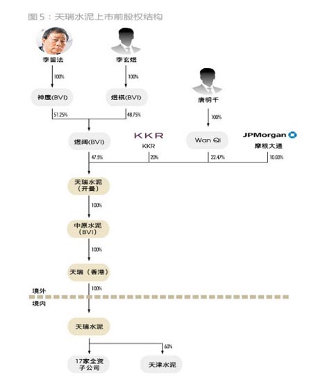 天瑞集團、KKR、摩根大通、Wan Qi(萬祺,2010年入股)作為天瑞水泥的股東,分別與天瑞(香港)簽訂股權(quán)轉(zhuǎn)讓協(xié)議,將各自持有的天瑞水泥轉(zhuǎn)讓給天瑞(香港)。其中,收購天瑞集團所持的股權(quán),由天瑞(香港)以現(xiàn)金代價8743萬美元支付;收購KKR等財務(wù)投資人所持有的合計52.5%股權(quán),由天瑞水泥(開曼)合計發(fā)行52.5萬股股票,分別按比例予以支付。天瑞集團拿到該筆款項之后,李家父子于2011年5月31日將該筆資金轉(zhuǎn)移至境外,并用于認購天瑞水泥(開曼)所增發(fā)的47.5萬股股份。至此,天瑞水泥的紅籌架構(gòu)徹底完成(圖5)。