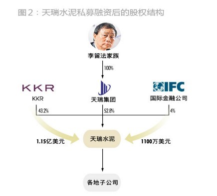 2007年上半年,天瑞水泥先后獲得美國PE巨頭KKR、國際金融公司總計1.26億美元的投資,其中KKR出資1.15億美元、國際金融公司出資1100萬美元。天瑞水泥是KKR在中國的第一個投資項目。此次投資完成之后,天瑞集團持有天瑞水泥52.8%股權(quán),KKR持有43.2%,國際金融公司持有4%(圖2),天瑞水泥由此變身成一家中外合資企業(yè)。除了股權(quán)融資之外,天瑞水泥同時還獲得約3億美元的巨額銀團貸款,其中國際金融公司貸出5000萬美元,摩根大通貸出約2.5億美元。