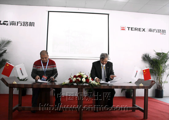 圖為南方路機董事長方慶熙(右)與順裕(龍巖)混凝土公司董事長鄭長征(左)簽定合作協議