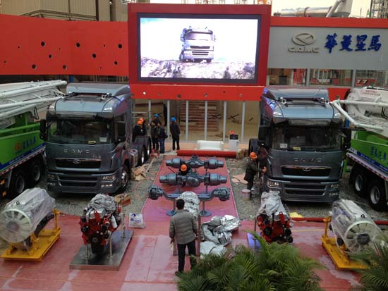 華菱星馬的展臺面積達(dá)1063平米, 參展整車為8臺,包括一臺華菱底盤56米混凝土泵車和一臺五十鈴底盤49米混凝土泵車,一臺常規(guī)動力10方混凝土攪拌車和一臺12方LNG混凝土攪拌車,一臺32噸隨車起重機(jī),一臺40噸礦用自卸車,一臺6×4右駕星凱馬牽引車,一臺6×4左駕星凱馬牽引車。其中56米混凝土泵車和32噸隨車起重機(jī)是首次對外展出。這兩款產(chǎn)品均是華菱星馬去年以來重點打造并于今年正式向市場推出的新產(chǎn)品,代表了其在專用車領(lǐng)域的最新技術(shù)成果。目前這兩款產(chǎn)品已經(jīng)完成了各項試驗、試制工作,正在加緊向市場推介過程中,其中56米泵車將在參展結(jié)束后交付上海城建物資有限公司。