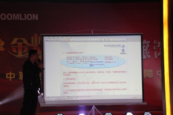 中聯重科云南保障中心于2013年3月17日,在美麗的滇池湖畔,召開了2013年開年來的第一次產品訂貨會。云南保障中心服務副總周鴻球出席活動,活動共邀請了昆明大區近200位客戶蒞臨現場。本次活動現場,成功簽約13臺產品,為即將到來的二季度銷售打下良好的基礎。