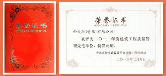 2013年2月27日青島市城鄉(xiāng)建設(shè)委員會召開建設(shè)管理工作會議,會上宣布西麥斯(青島)有限公司被山東省建筑工程管理局評為“2012年度山東省建設(shè)工程質(zhì)量先進單位”,成為本年度青島市混凝土行業(yè)唯一獲此殊榮的企業(yè)。