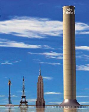 由澳大利亞能源任務(wù)有限公司設(shè)計高達1千米的太陽能塔,美國政府很可能會接受這項設(shè)計理念,并計劃在美國西南部建造。太陽能塔是升級版的太陽能煙囪,太陽能煙囪是一項歷史悠久的技術(shù),利用太陽能加熱空氣形成自然上升氣流,進而制造電能。
