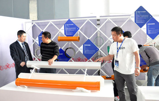不少用戶駐足在產品配件展示臺前細細打量,與中聯重科技術人員溝通交流