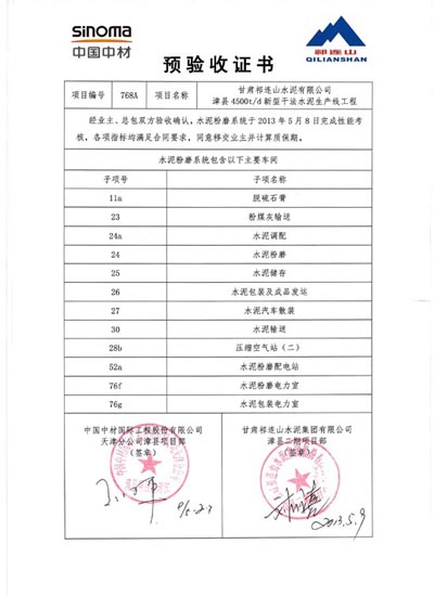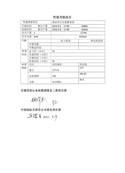 5月8日17:00,由中材國際天津公司承建的祁連山漳縣項目水泥系統完成連續72小時運轉考核,經業主、總包雙方確認,所有考核指標均滿足合同要求,考核一次性通過。隨后,雙方項目負責人在預驗收證書上鄭重簽字,這標志著漳縣項目的水泥系統移交業主管理并投入正式生產。