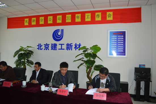 4月17日,北京建工新型建材天津公司召開2013年度工作會。新型建材公司總經理左玉龍出席并講話,黨支部書記朱清泉主持會議,天津分公司經理張登平作2013年工作思路報告,常務副經理張喜凱公布了2012年指標考核的結果,對2013年指標責任狀進行了解讀。張登平與單位副總經理、各部室部長和相關人員簽訂了責任狀。各部部長匯報2013年工作要點。天津公司班子成員、各部部長、班組長、業務員、一般管理人員和青年職工代表共53人參加會議。