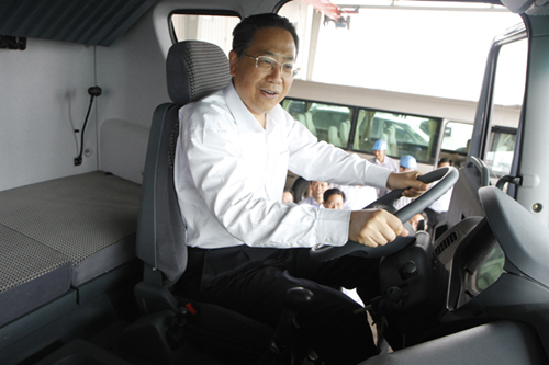 在總裝車間出口處,李錦斌駐足在剛剛下線的一輛華菱星凱馬車前,詢問了車輛的性能和市場銷售情況,并登上駕駛室,親自體驗這款高端重卡的駕乘感受,寬大的空間、精美的內飾、電子設備和完備的安全設施讓他贊不絕口,連說“不錯”……隨后,李錦斌一行還參觀了停在廠區內的物流車、工程自卸車、礦用自卸車、泵車、LNG車型等公司主要產品,并聽取了公司有關負責人對發動機產品開發情況的匯報。