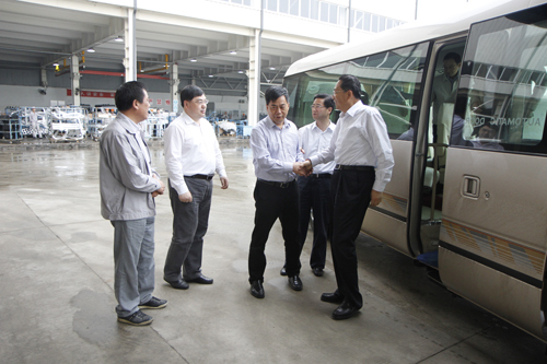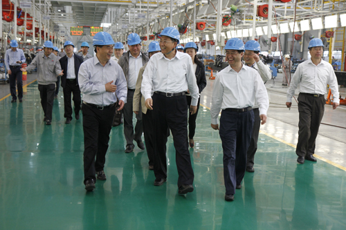 上午11時整,李錦斌一行驅車來到公司開發區南區新基地的華菱總裝車間,一下車就與等候的劉漢如董事長親切握手交談起來,劉漢如就公司的發展歷程、十二五規劃、1—4月的產銷情況等一一向李錦斌作了匯報。