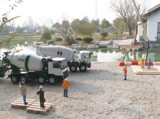 撐開極富特色的super X結構,安裝上支腿支撐,模型像真車一樣被架離地面,緩緩打開臂架,手中立刻就能感受到那種穩定有力的油缸勁道,不松、不澀,四節修長的臂架全部伸展開來,可以擺出任意造型,即使是全趴的“一”型,底盤也穩若磐石,各種現實工況的成功模擬,也反映了CONRAD的另一大優勢特色,即良好的結構機械性能,而國內品牌的泵車模型由于設計分配不合理、制作工藝差,幾乎無一能夠做到。而另一款施維英施德達攪拌車,同樣也是沉甸甸的敦實質感,綠色的logo打在白色的罐子上,借用某服裝品牌的廣告語,“簡約而不簡單”。拍攝和后期制作過程中,我特意把一部分照片的背景環境改成了黑白色,在暗調的映襯下,綠白兩色的施維英模型顯得更加優雅、古樸,透著濃濃的德國制造范兒。