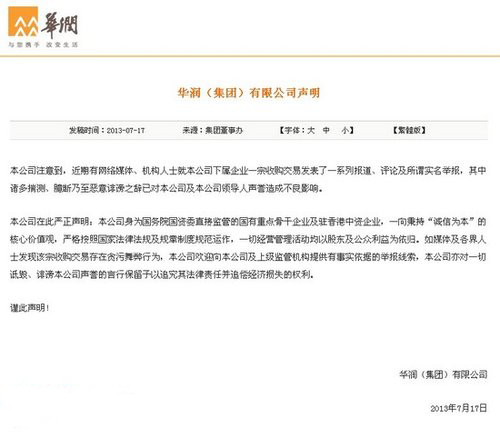 7月17日下午,華潤集團針對該公司高層遭《經(jīng)濟參考報》首席記者王文志實名舉報一事發(fā)布聲明稱,該舉報中“存在諸多揣測、臆斷乃至惡意誹謗之辭”,并表示“歡迎向本公司及上級監(jiān)管機構(gòu)提供有事實依據(jù)的舉報線索,本公司亦對一切詆毀、誹謗本公司聲譽的言行保留予以追究其法律責(zé)任并追償經(jīng)濟損失的權(quán)利”。