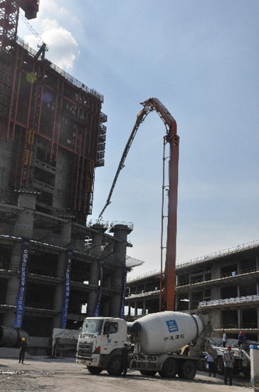 7月28日,中建商砼與中聯重科強強聯合,成功使用101米“全球最長混凝土臂架泵車”完成“華中第一高樓”武漢中心C40梁板混凝土澆筑。