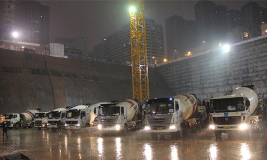 9月3日晚上7:30,中建商砼長沙站發往長沙國際金融中心首車砼順利抵達施工現場,該項目地下室負五層底板正式開始澆筑,現場9臺車泵同時開工,供應商品砼17000立方米,創單次最大體積混凝土澆筑長沙之最。