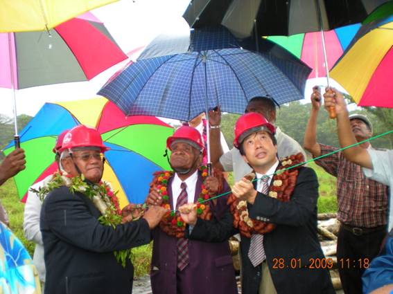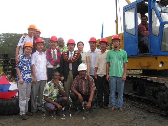 斐濟國土部部長,酋長,和韓大使牽引打樁機作業