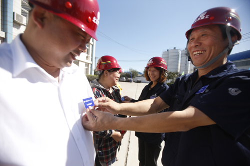 攪拌站工作人員為環保監督員佩戴胸牌,有了這個胸牌,監督員們可以在一天里的任何時候來攪拌站監督檢查