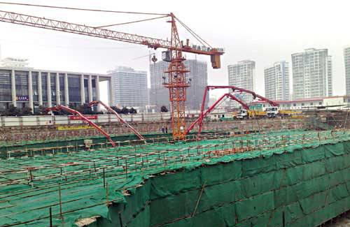 蘇州潤華環(huán)球大廈,一座集商業(yè)中心、酒店式公寓、辦公大樓于一體的摩天大樓。占地面積約15000平方米,總建筑面積約18萬平方米,結(jié)構(gòu)高度約190米,總高度約286米。這座即將成為蘇州新地標(biāo)的建筑,其混凝土泵送的主力設(shè)備清一色采用的是三一重工泵車。