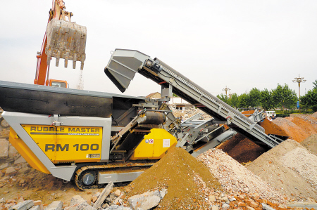 6月1日,河南許昌,一臺履帶式移動遙控指揮建筑垃圾破碎機“吃掉”旁邊的建筑垃圾。據悉,被拆遷后的建筑垃圾只要被填進這種進口的履帶式移動遙控指揮建筑垃圾破碎機內,就會分粗、細將建筑垃圾變成可砌墻、粉墻或鋪路的材料,使建筑垃圾循環再利用。