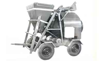 1973年設計,由上海市華東建筑機械廠生產(chǎn)的JSC-1雙錐形混凝土攪拌機,該機為正反轉(zhuǎn)自落式攪拌機,正轉(zhuǎn)攪拌、反轉(zhuǎn)出料。最大混凝土攪拌量為335公升,機重2.5t。