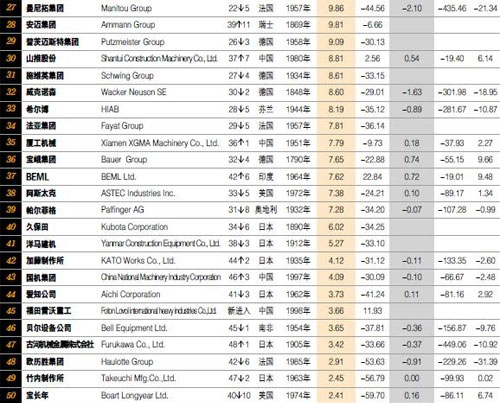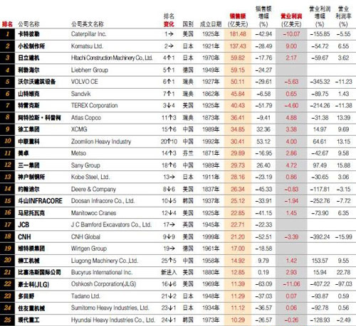 2009年,中國最大的工程機械制造企業(yè)—徐工集團,憑借34.85億美元的銷售收入,成為歷史上首個躋身全球10強的中國企業(yè)。和徐工集團表現(xiàn)一樣出色的,還有中聯(lián)重科、三一集團、柳工和龍工等企業(yè)。在新一屆榜單中,中國前5家企業(yè)的排名各自上升了6位、10位、6位、5位和9位;與此同時,本次排行榜中另一個新面孔—來自中國的福田雷沃重工,甫一進入,便以3.66億美元的銷售額位居第45位。憑借如此良好的企業(yè)級“漲勢”,2010年TOP50排行榜中的“國別”榜單上,“中國”毫無懸念地超越傳統(tǒng)工程機械產(chǎn)業(yè)強國—德國和瑞典,升至第三。