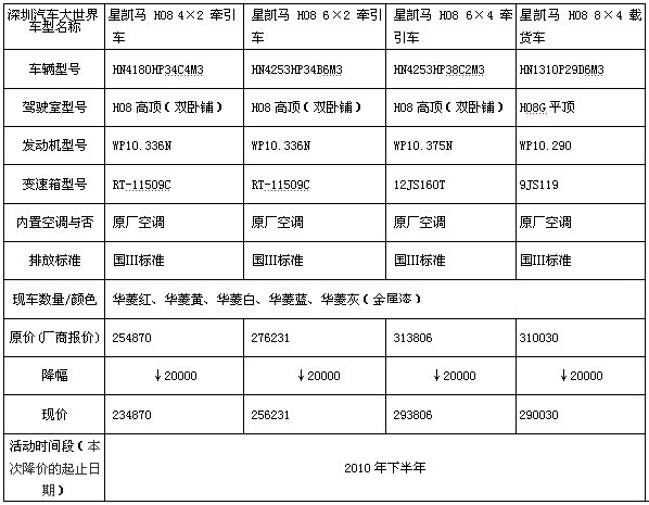 安微華菱是重卡行業(yè)的后起之秀,被稱為重卡領(lǐng)域的“黑馬”,先后推出華菱重卡、華菱之星和華菱星凱馬。因節(jié)油優(yōu)勢明顯,星凱馬系列產(chǎn)品銷量增長迅速,深圳華菱銷售區(qū)域華菱星凱馬現(xiàn)車充足,價格有大幅度下降,華菱星凱馬H08系列全系暴降2萬元!