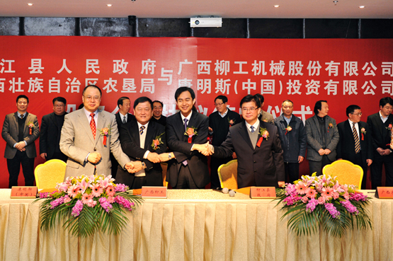 1月30日上午,柳工股份公司、康明斯(中國)投資有限公司與柳江縣人民政府、廣西壯族自治區農墾局,在柳州市柳江縣隆重舉行投資協議簽約儀式。柳江縣縣長覃建波、自治區農墾局副局長甘羽翔與我公司董事長王曉華、康明斯公司副總裁劉曉星分別代表各方簽署投資合作協議。自治區黨委常委、自治區副主席林念修,市領導陳剛、鄭俊康、蘇海棠,柳江縣領導覃衛國,以及柳工領導曾光安、章二平、黃建兵、黃海波等共同見證簽字儀式。