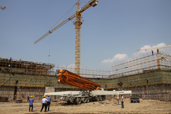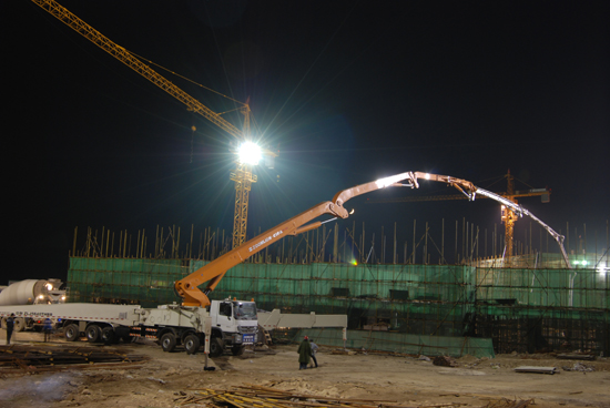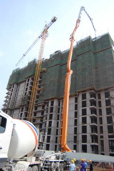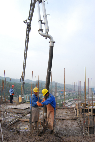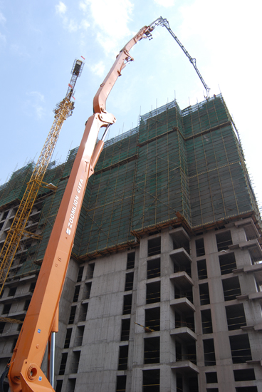 他表示目前他現在正在施工的政法大樓、人民醫院、保障性高層住宅都在使用這款中聯重科80米碳纖維技術泵車,使用狀況非常好。山西靈石宏鑫商品混凝土有限責任公司燕管柱先生自稱也是一個工程機械迷,對機械的使用有這自己的見解和研究,中聯重科的設備給他留下美好的記憶,他擁有了目前世界上最高的混凝土泵車,興奮之余購買了很多條幅懸掛在工地高樓之上—祝賀全球最長臂架泵車落戶山西靈石。