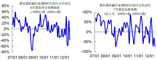 機床的生產(chǎn)已經(jīng)產(chǎn)生了影響,目前生產(chǎn)已經(jīng)只有去年2/3的工作量。但是工作只是休息日增加,暫時沒有長休假的計劃。隨著未來需求的下滑,很有可能一些臨時雇用員工會首先受到?jīng)_擊。6月份工程機械銷量同比下滑繼續(xù)收窄,政策效果尚未顯現(xiàn)6月份的工程機械銷量同比數(shù)據(jù)將繼續(xù)上升,估計下滑幅度降至20%左右,但目前的回暖仍然是基數(shù)效應(yīng)而非需求驅(qū)動。