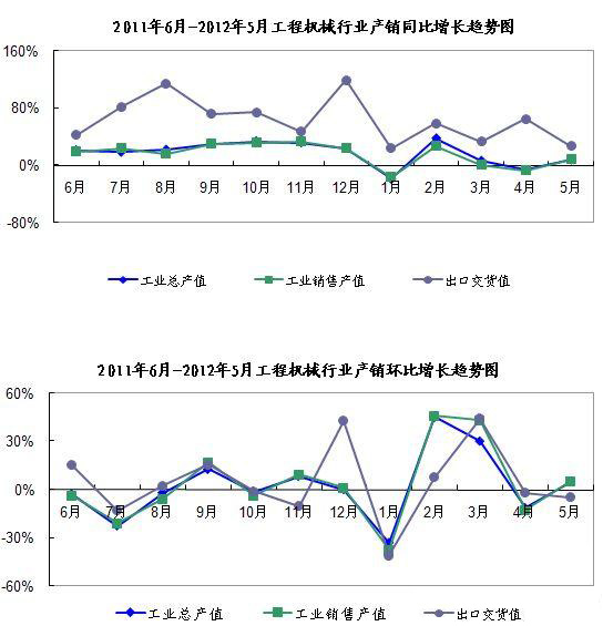 2012年5月,全國工程機械行業(yè)產(chǎn)銷同比、環(huán)比均略有增長,出口交貨值均略有下滑。