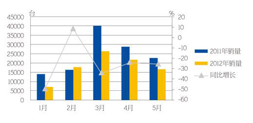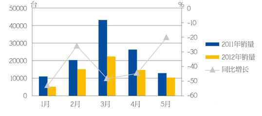 2012年1-5月,工程機械產品產銷在2011年同期較高的基數上出現了較大幅度的下降。其中挖掘機、推土機、汽車起重機及壓路機2012年1-5月累計銷量同比降幅均超過了30%。工業車輛、裝載機和平地機的銷量有2%~3%的增長。2012年1-5月行業銷量同比降幅較大,這是由于2011年1-5月的銷量偏高。預計6月以后同比降幅將會減小。