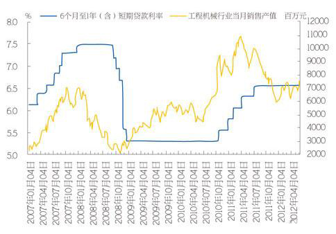 圖6 2001年1月-2012年4月短期貸款利率變化與工程機械行業運行情況對比