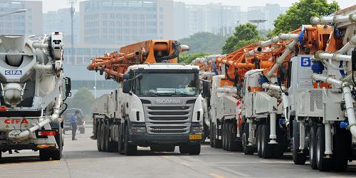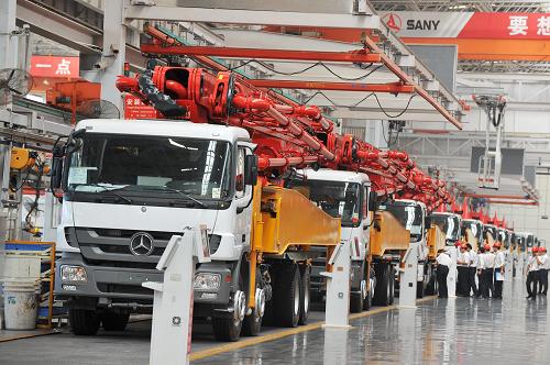 一輛組裝下線的泵車駛出中聯重科總裝車間