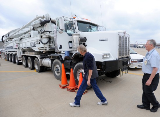 圖為世界上最大型的混凝土泵車之一在洛杉磯機場裝載上機。