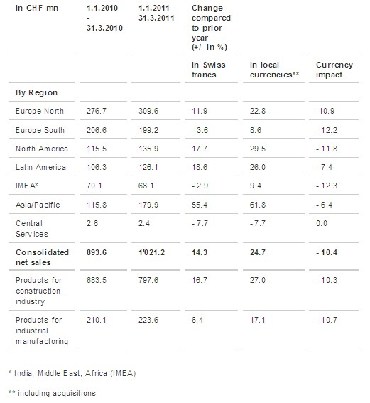 在2011年第一季度,建筑工業產品和工業制造產品需求量增大。在當地貨幣兌換中,西卡對建筑工業產品的銷售額提升了27%,其中8.5%得益于收購公司。另外工業制造產品銷售額增加17.1%,其中0.3%來源于收購公司。