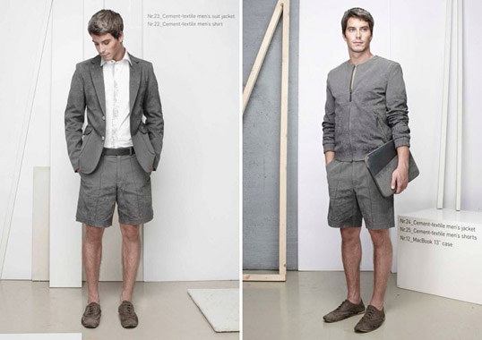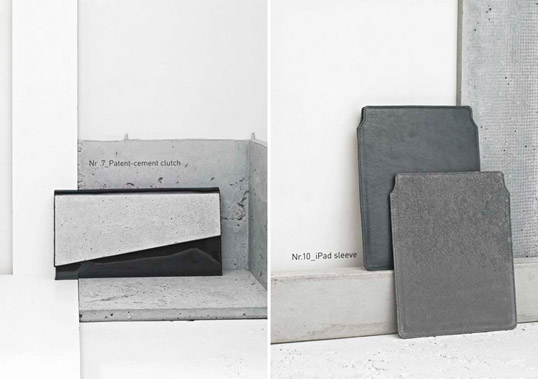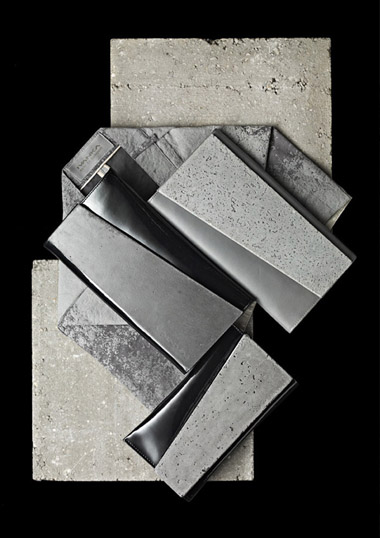 2012年9月,巴黎時裝周,一個由混凝土制作的時尚系列徹底震撼了人們的視覺。這個創新的時尚系列為經典的女性柔美注入了陽剛元素,更符合當今現代都市女性的性格。將混凝土的機理用不同柔軟度的紡織物體現,再通過各種形狀和材質展現紛呈魅力。箱包的設計甚至引入整塊混凝土與高品質皮革搭配,兩者之間比例的變化形成各有千秋的效果。用日常性的設計超越生活。