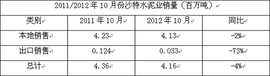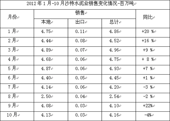 據阿拉伯國家媒體11月10日報道,沙特14家水泥公司(包括Safwa水泥公司在內)2012年10月份的銷量降至416萬噸,2011年同期的銷量為436萬噸,詳情如下: