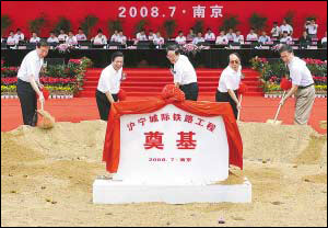 7月1日上午,鐵道部、江蘇省和上海市在南京仙林聯合召開滬寧城際鐵路開工動員大會,這標志著備受矚目的滬寧城際鐵路正式開工建設。中共中央政治局委員、上海市委書記俞正聲出席并宣布工程開工。鐵道部部長劉志軍、江蘇省委書記梁保華、上海市市長韓正在開工動員大會上講話。江蘇省省長羅志軍主持動員大會。