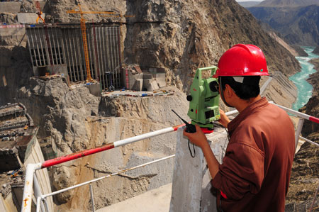 為達到創精品工程的目標,拉西瓦水電站建設單位在水電站壩址區建立了完善的測量控制網。工程測量人員頂烈日、戰嚴寒,對每個部位控制坐標進行高精度復測。目前,混凝土澆筑等項目優良品率達到92%以上。圖為測量人員在進行大壩倉號模板復測。