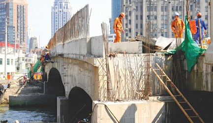 近日,在河南路橋施工現場,橋面和橋底幾十名工人正頂著烈日冒著酷暑加緊施工。據現場工人介紹,8月底這座橋的部分車道將通車,以緩解河南路的交通壓力。與過去的老河南路橋相比,新橋更為寬闊雄偉。橋面寬達29米,比原來寬了10.5米,設雙向6車道,橋梁從原來的3孔改為5孔,色調仍以原來的混凝土色為主。