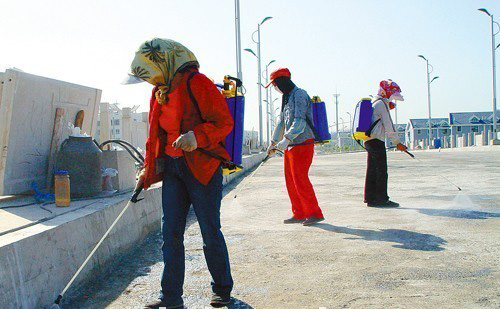 8月10日,建筑工人用噴霧器在新建的克拉瑪依河上的油建橋上噴灑混凝土保護(hù)劑。據(jù)介紹,這種有機(jī)硅混凝土保護(hù)劑具有良好的耐磨損性、耐沖擊性、耐熱性和抗腐蝕性的作用,它是首次在我市橋梁施工中使用。
