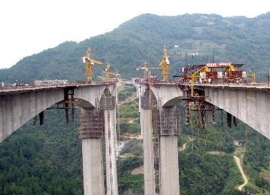 28日上午,湖北滬蓉西宜昌至恩施高速公路十二合同段龍?zhí)逗犹卮髽騽倮蠑n。龍?zhí)逗犹卮髽蛉L1182米,由中鐵十七局和湖北路橋有限責任公司聯(lián)合承建。主橋上部結(jié)構(gòu)為全預(yù)應(yīng)力混凝土懸澆連續(xù)鋼構(gòu)箱梁,主墩采用雙肢變截面矩形空心墩,最大墩高178米,居世界同類橋梁墩高之最。