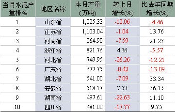 分省市來看,產量前10的水泥大省中,有8個省的環比增長出現下降,僅浙江和安徽出現正增長。而山東省仍然保持水泥產量的龍頭地位,7月份水泥產量為1,225.33萬噸,但是卻呈現出負增長態勢,環比下降12.06%,同比下降4.46%。