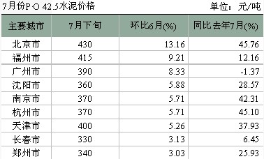 7月份水泥價格發生較大變動的主要是以下幾個地區,其他地區的水泥價格維持在6月水平: