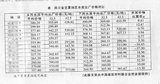 截至7月末,四川受災地區水泥生產還沒有恢復到震前水平,水泥出廠價格基本保持震前水平,但四川建材企業原燃料和動力價格上漲幅度較大。