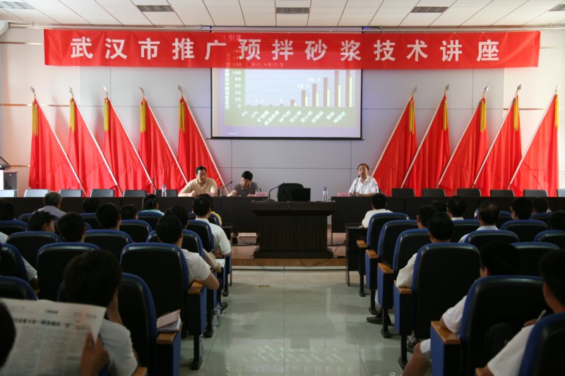 為進一步貫徹落實《市政府通告》(武政[2008]8號)和"武漢市預拌砂漿推廣應用工作會" 的會議精神,努力在全市營造全面推廣預拌砂漿的社會氛圍,9月8日下午武漢市商品混凝土管理站在市建委教育培訓中心舉辦"武漢市推廣預拌砂漿技術講座",會議由張曉秋站長主持,市區各建管部門、商砼生產企業、施工、監理等單位以及相關媒體220多人參加了會議。
