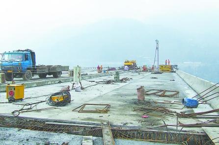 都汶高速公路廟子坪特大橋所有橋身的復(fù)位工作已經(jīng)完成,發(fā)生橋身跌落的第10跨橋面混凝土也已鋪設(shè)完畢。記者昨日在大橋上看見,第10跨橋面外觀已和整座大橋融為一體,如不仔細(xì)察看,很難看出這跨橋身曾因地震發(fā)生過(guò)跌落。目前,施工人員正在橋面新鋪的混凝土上切割收縮縫。