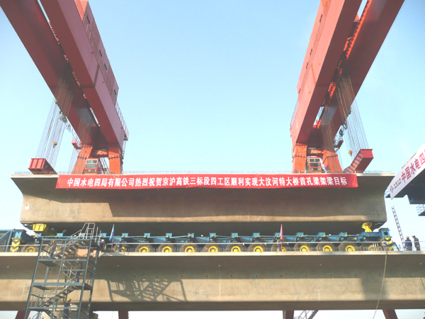 應用900噸運梁車和900噸架橋機聯合架設混凝土預應力箱梁是京滬高速鐵路股份有限公司對各京滬高速鐵路全線6個標段進行年度綜合履約信譽評價的重要項目。因此,也是中國水電集團京滬高鐵項目部2008年的重要節點目標之一。集團京滬高鐵項目部特別重視,對架梁工作進行了精心部署,為激勵集團系統內四個制梁場的積極性,設立了20萬元的勞動競賽專項獎,獎勵率先實現正式架梁目標的單位。公司京滬高鐵項目部積極響應,全力以赴組織開展架梁的各項準備工作,針對國家加大鐵路建設投資,鐵路建設市場迅速發展,運梁車、架橋機等鐵路建設大型機械設備生產能力不足,供貨嚴重滯后的困難,項目部派專人在設備制造廠家現場監造,公司副總經理李斌專程前往設備生產廠家進行督促協調,以盡量縮短供貨時間。設備陸續進場后,運價大隊周密部署,克服了野外寒冷,夜以繼日,連續作業,全力配合設備制造廠家進行拼裝調試,保證了年內正式架梁目標的順利實現。