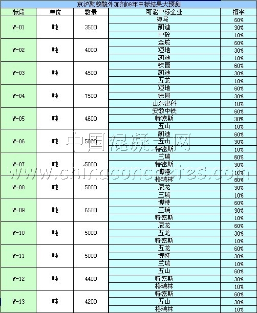 09年1月7日~1月13日,中國鐵路物資總公司再次發售新建京滬高速鐵路聚羧酸外加劑第二次招標標書,已于2月3日上午10:00正式公布開標結果。中國混凝土網不斷跟蹤最新結果發現,部分知名企業,如:山西黃騰,已經淡出了人們的視線,再加上中標結果的撲朔迷離,引起了更多業內人士開始了猜疑與大膽的預測。以下預測僅代表一家之言,與最終結果一定有較大出入,敬請業內人士提供相關信息,我們將及時予以調整。 主要預測依據為:1、2008年相應標段的供貨商產品及服務情況。2、投標人產品品質、價格及保供能力。3、中國人都知道的理由。