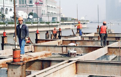 近日,外白渡橋新橋墩基本整修完畢,主體結構建成。橋的舊木樁也已經全部清除,新的混凝土樁基本完工。與此同時,外白渡橋橋身已進入最后修繕階段,據現場工人介紹,本月25日橋身有望復位。
