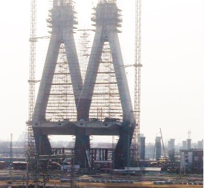 鐵路上不可能出現墩柱,那么1公里長的橋梁如何搭建起來呢?熊經理介紹,“我們采用了特別的工藝。主橋斜拉跨線橋采用牽索掛藍懸臂施工,將來我們可以看到,從主塔兩側各150米的跨度中,將有21對、168根鋼索依次與橋體‘鎖定’,最長的一條鋼索154.715米,和梁面夾角29.875度,最短的一條為48.607米,和梁面夾角73.529度,共同完成了‘拉’起橋身的任務。東引橋采用頂推法施工。70米的跨度,需要先預制一根重約3200噸的整體箱梁,然后通過千斤頂將這根梁整體頂推。但由于是在鐵路線上施工,會受到鐵路運行時間的限制,所以工程將采用分階段頂推。為保證如此重的梁體在空中的安全,將在其下部搭起4排32個臨時墩柱,接力傳送梁身,確保精確到達。”