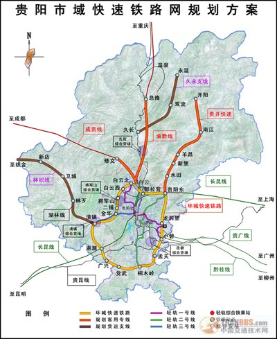 在鐵道部及成都鐵路局的大力支持下,在省委、省政府的正確領導下,貴陽市擬規(guī)劃建設貴陽市域快速鐵路網(wǎng),初步方案為“一環(huán)一射兩聯(lián)線”。“一環(huán)”即貴陽環(huán)城快速鐵路,全長約115公里。“一射”即貴陽至開陽快速鐵路,全長約55公里。“兩聯(lián)線”即修文久長至開陽永溫鐵路,全長約40公里;清鎮(zhèn)至織金鐵路,全長約122公里。“一環(huán)一射兩聯(lián)線”總投資約235億元,預計今年開工建設,“一環(huán)一射”力爭4年建成,“兩聯(lián)線”力爭2年建成。